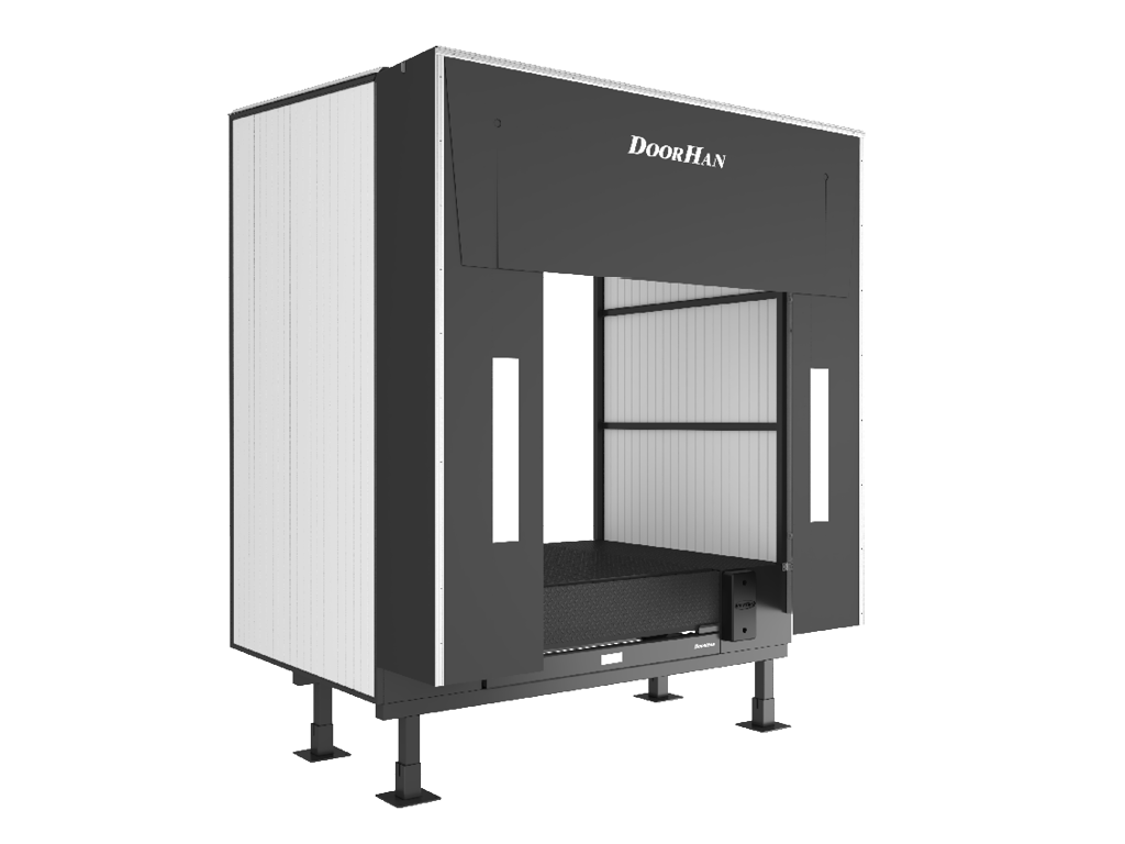 Модель тамбура DHOUS 90. Тамбур перегрузочный прямой (90°) стандартной серии под уравнительную платформу с поворотной и выдвижной аппарелью встроенного типа.